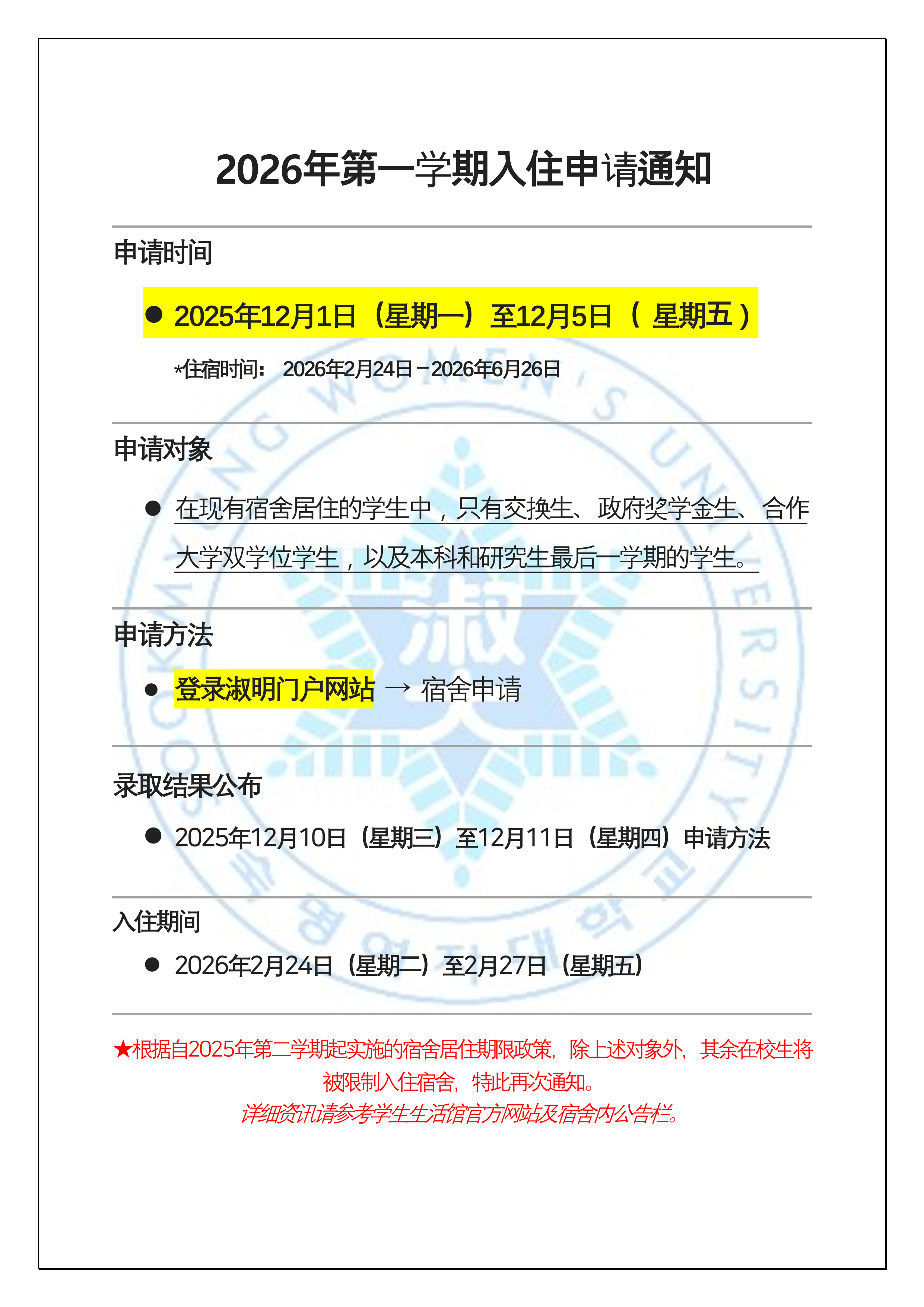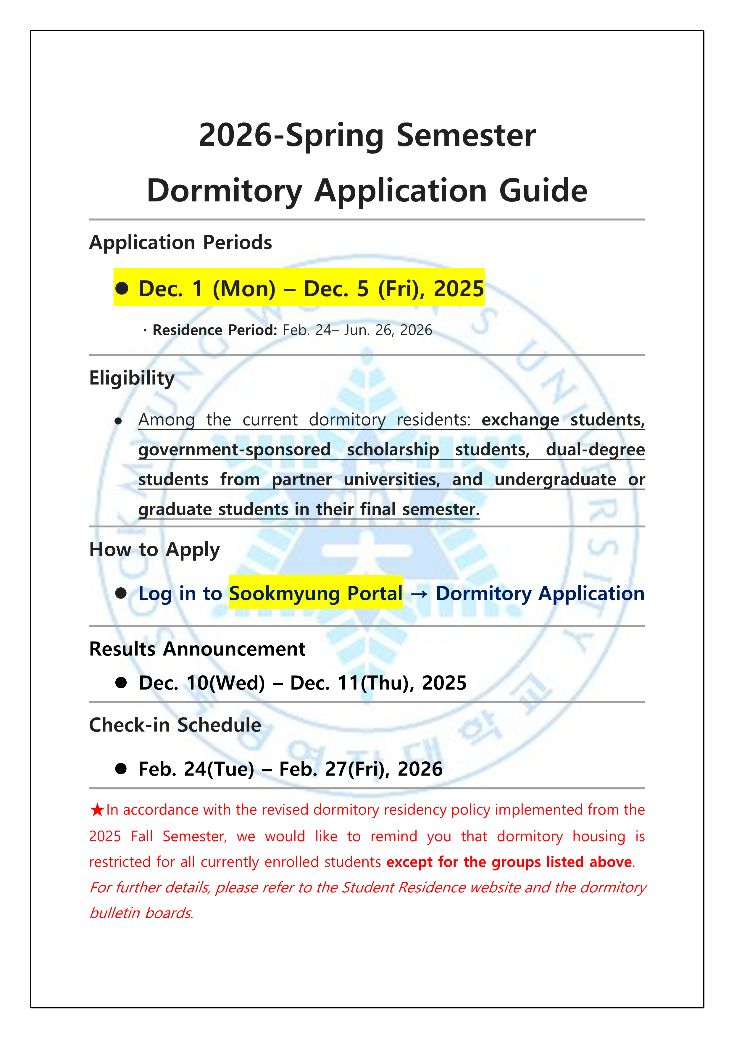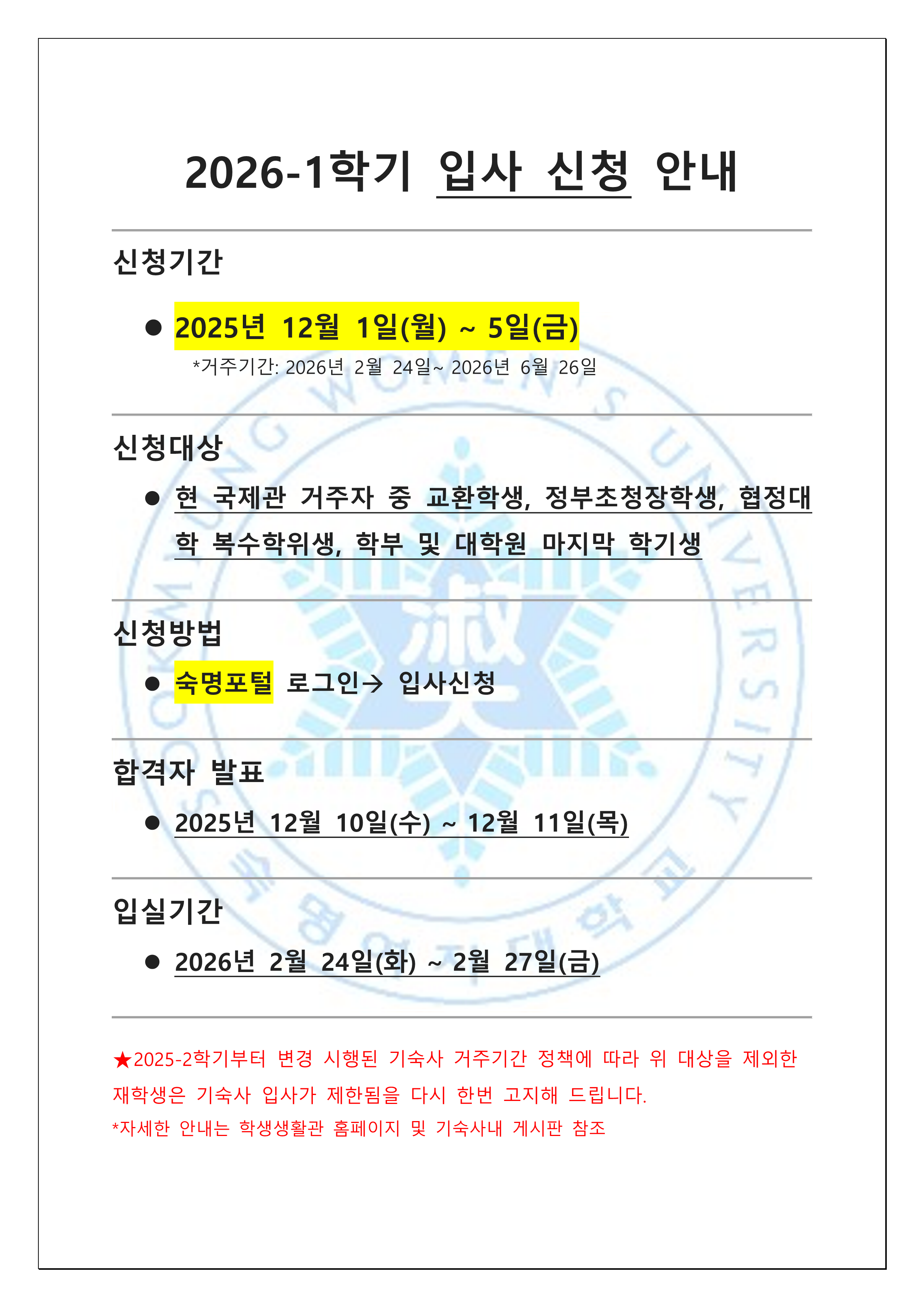 [Notice] 2026-1학기 입사 신청 안내(국제관거주자용)/2026-Spring Semester Dormitory Application Guide(For the current dormitory residents)