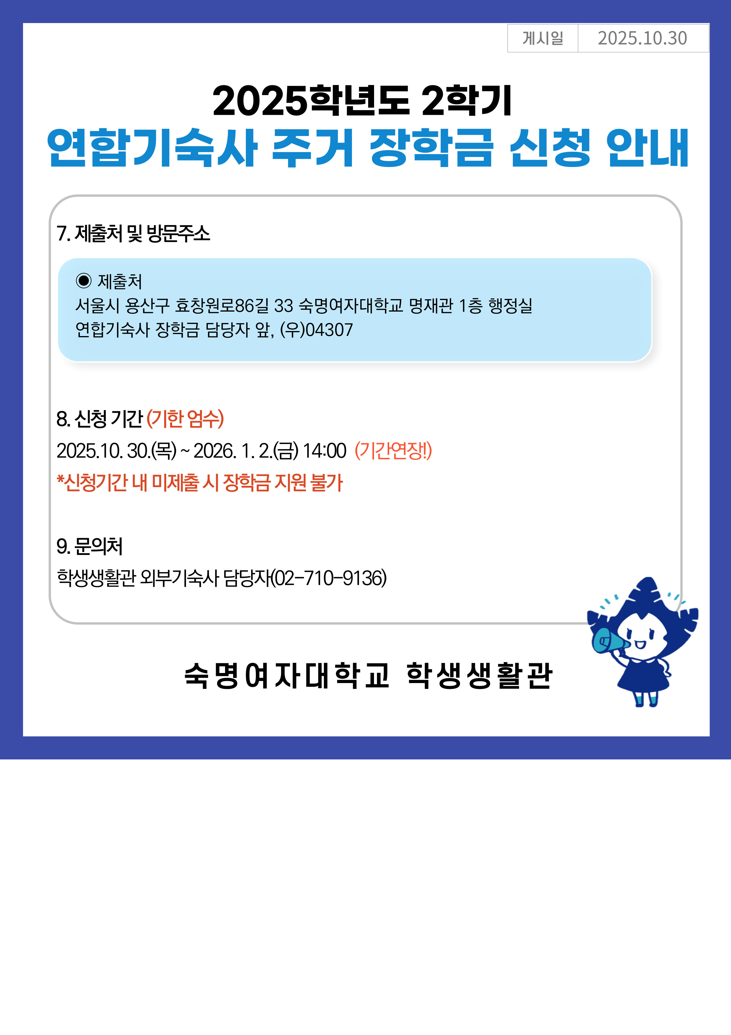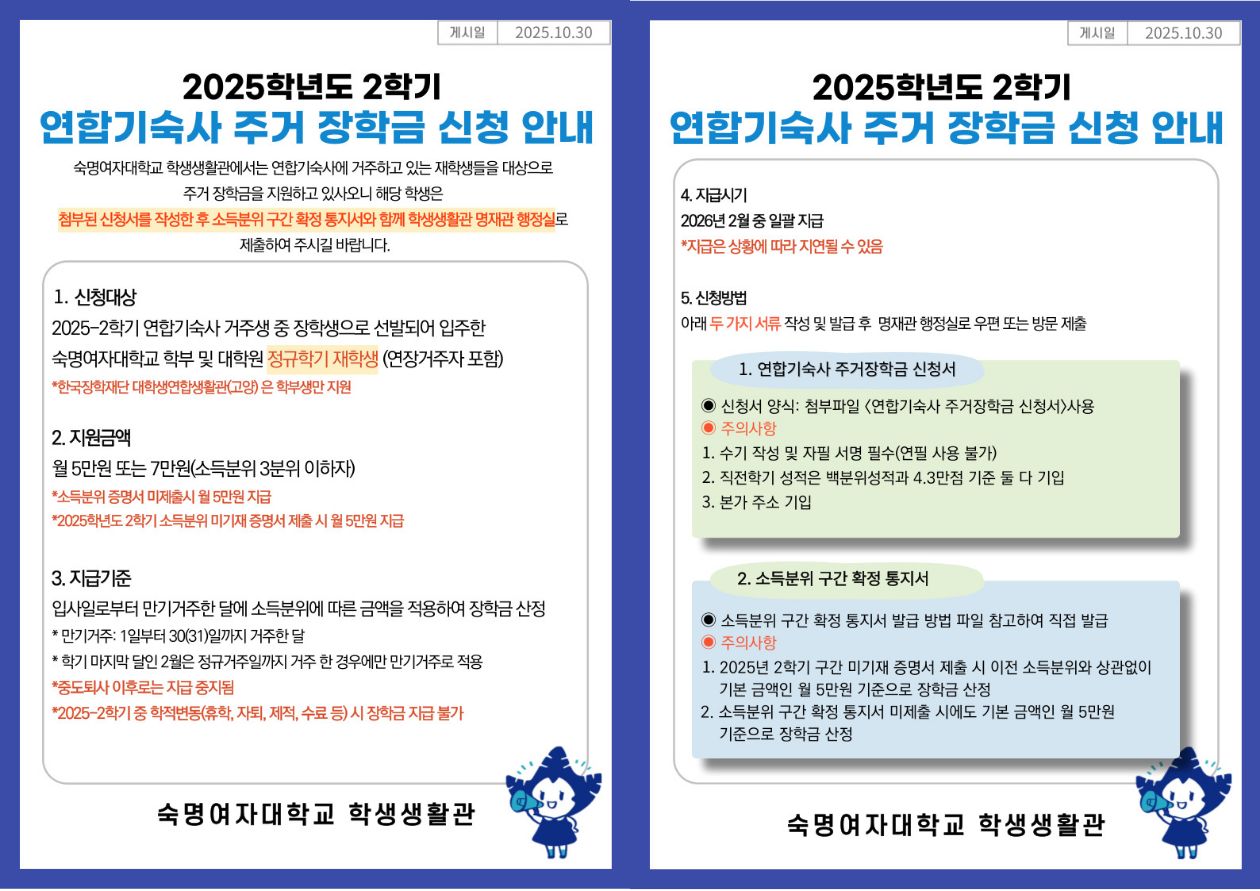 숙명여자대학교 학생생활관에서는 25-2학기 연합기숙사 주거장학금 신청에 대해 안내드립니다.